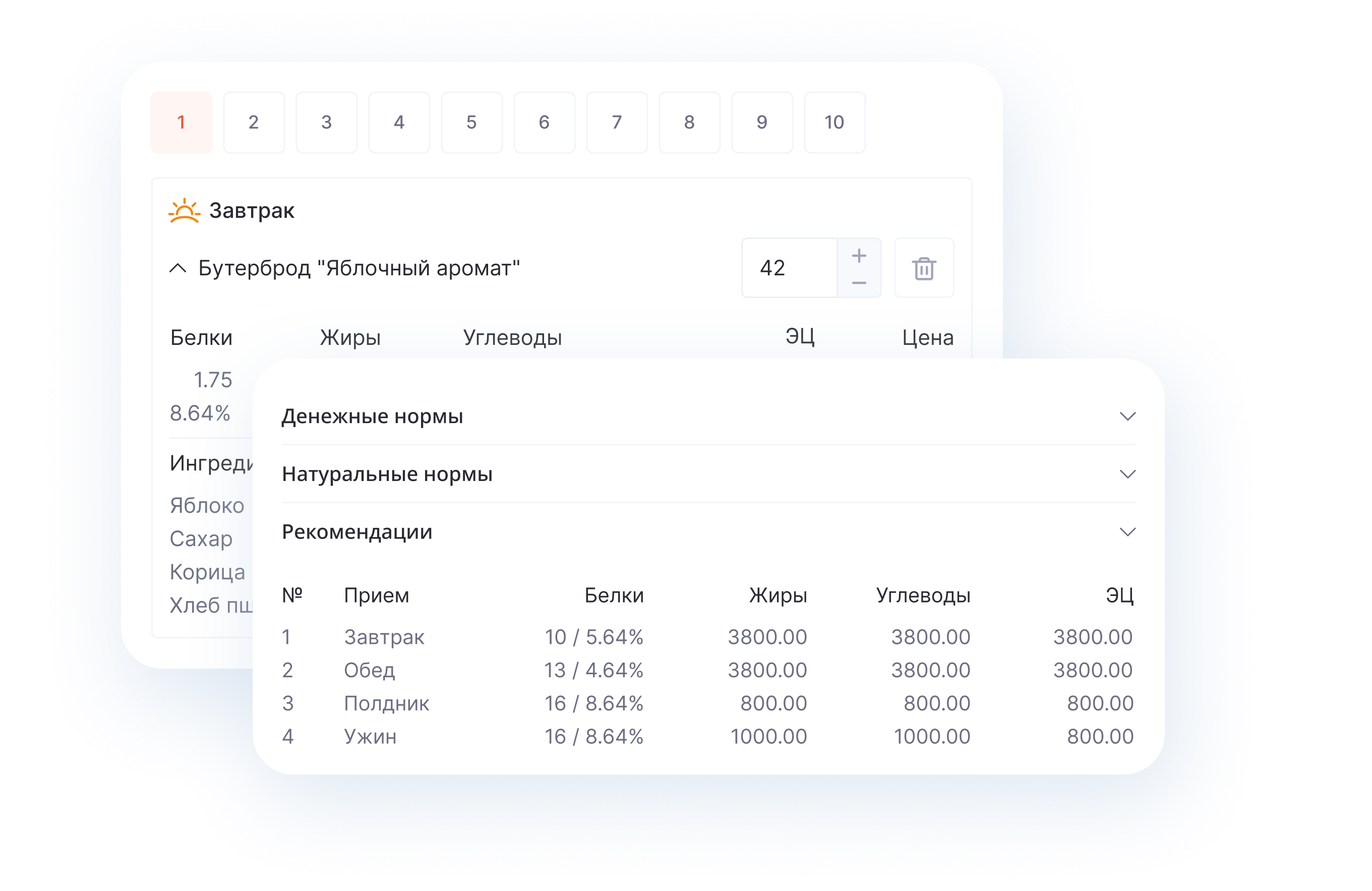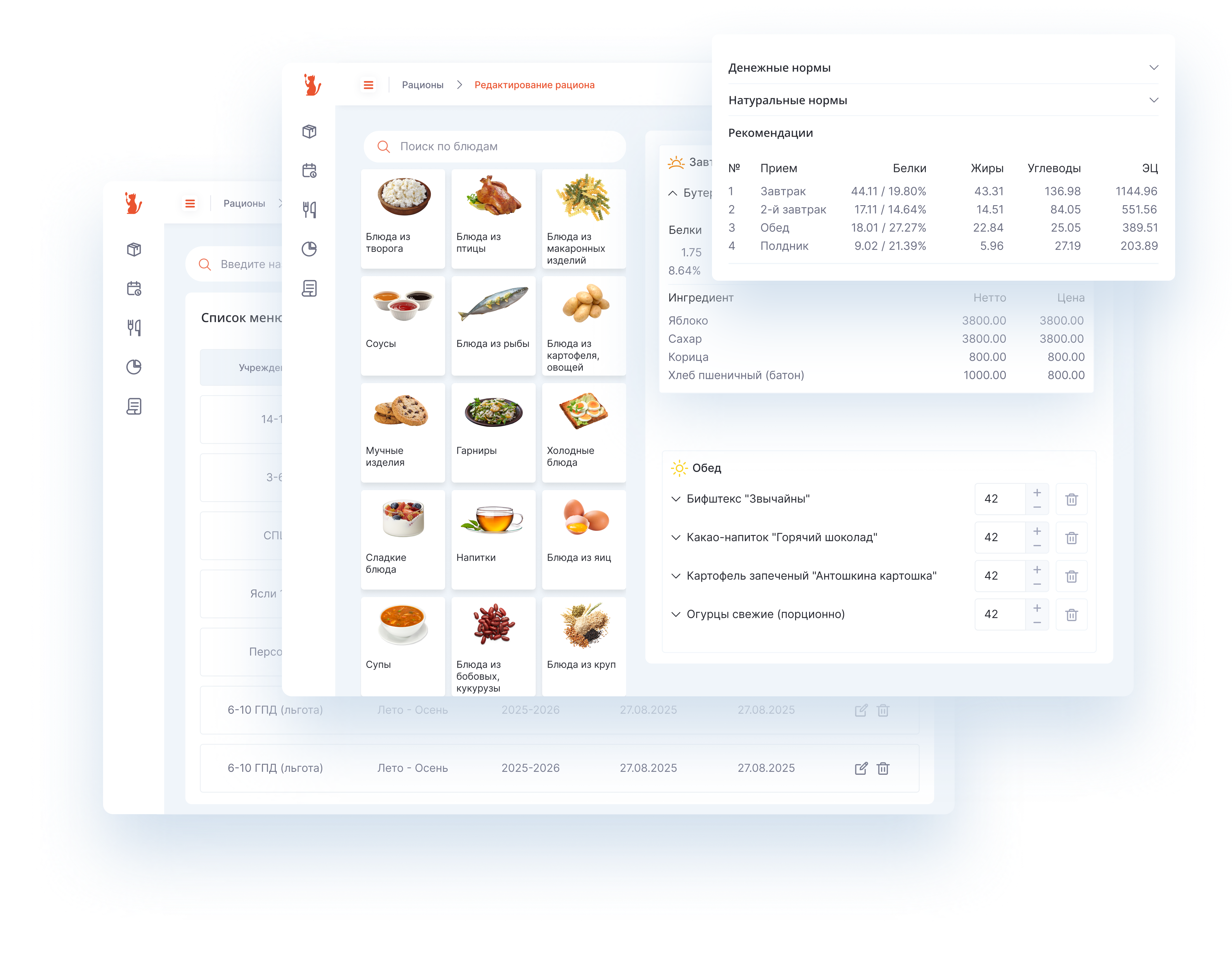Удобный конструктор для разработки примерных двухнедельных и суточных рационов позволяет сотрудникам центров и учебных заведений быстро и корректно сформировать меню с учетом пищевой и энергетической ценности блюд.
